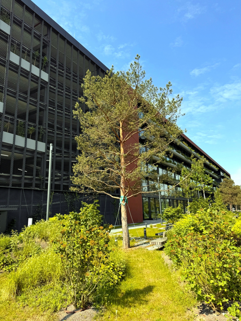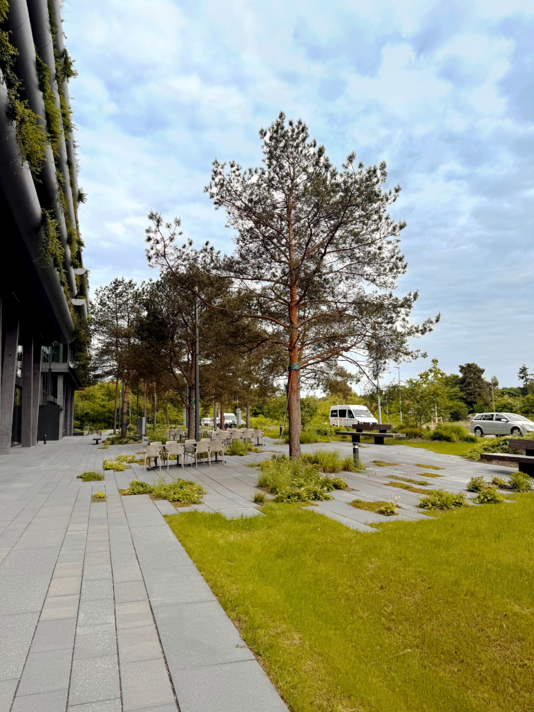 Wesentliches Gestaltungselement des Campus‘ ist eine landschaftlich geprägte Pflanzung, in die die Sitzbereiche in topografisch überformten Bereichen integriert sind. Die Vegetation wird wesentlich geprägt von hochstämmigen Föhren, die adressbildend auf dem Vorplatz stehen und vereinzelt, kombiniert mit Speierling, in der Freifläche nochmal auftauchen. Ergänzt wird diese landschaftliche Pflanzung mit Gruppen aus Wildsträuchern wie Felsenbirne, Hundsrose, Pfaffenhütchen u.a. sowie Flächen mit artenreichen Wiesensaaten aus regionaler Herkunft.