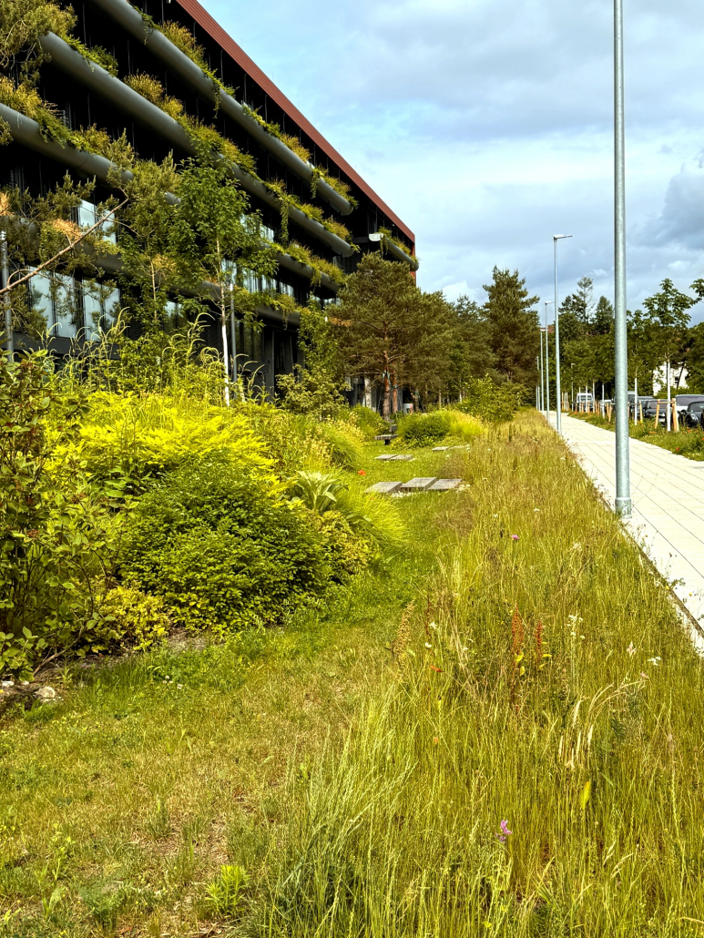 Für die von Schmelzle + Partner Architekten transparent gestaltete Fassade wurde eine intensiven Begrünung in einem vorgehängten Trogsystem geplant. Das Begrünungskonzept setzt sich aus standortbezogenen Pflanzengesellschaften aus Kletterpflanzen, Kleingehölzen, Stauden und Gräsern zusammen.