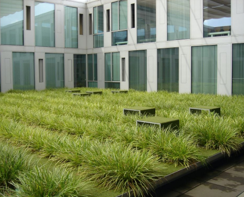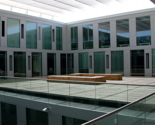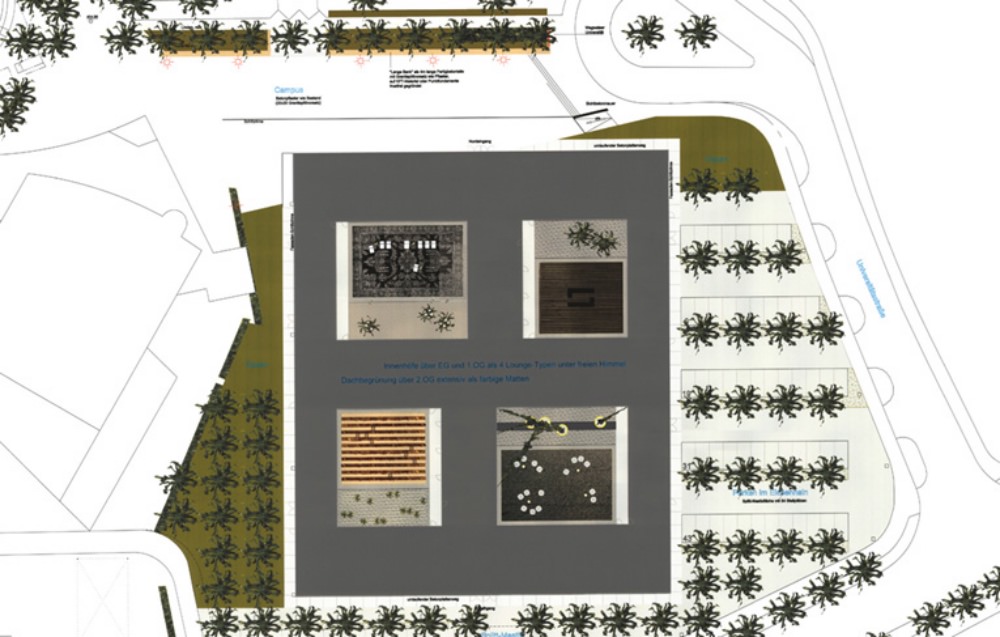 Die Verfasser überzeugen mit einem klaren, konsequent umgesetzten und durchaus überraschenden Konzept. Sie haben sich für die Gestaltung von vier Innenhöfen eines universitären Gebäudes für das Motiv von stilisierten Teppichen entschieden, die sie mit angemessenem – nicht übertriebenem – Aufwand gestaltet haben.
