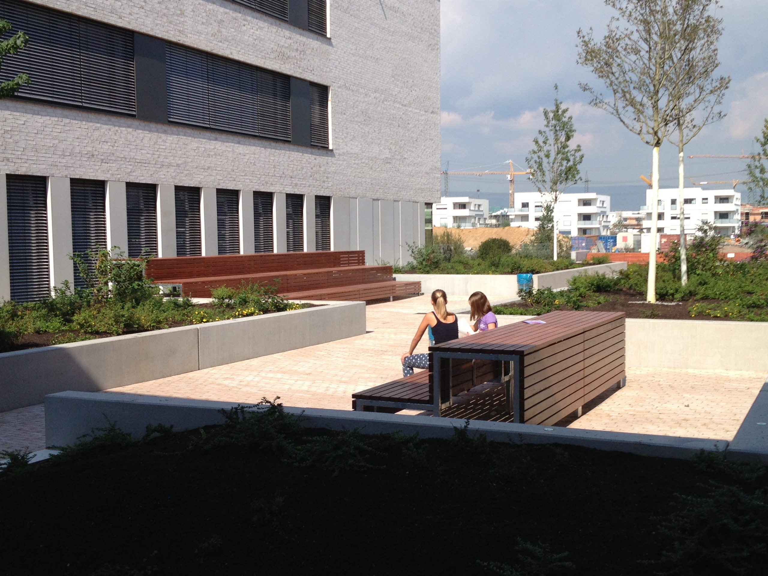 Prägende Elemente der Freiraumgestaltung sind Holz-Stahlrohrmöbel, die in einfachen, robusten Modulen auf verschiedene Nutzungen zugeschnitten sind. Die Pflanzenauswahl wurde, soweit die Anforderungen der Stadt an Pflege und Robustheit es zuließen, unter dem naturwissenschaftlichen Aspekt des Global Phenological Monitoring erweitert. In den intensiver gestalteten Bereichen kommt Ziegelklinker in Anlehnung an die Fassaden zum Einsatz.