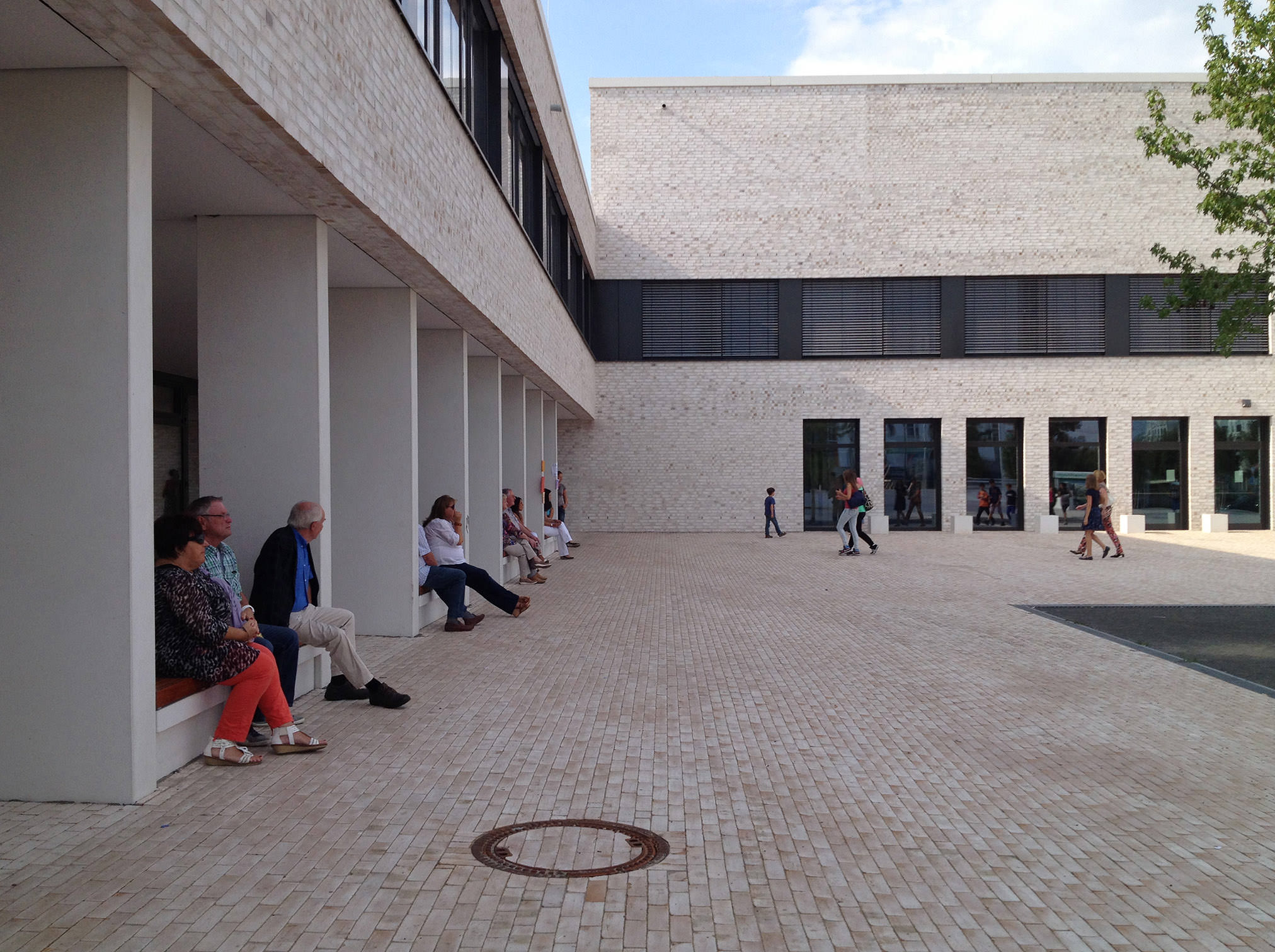 Der Pausenhof verzahnt sich mit der kammartigen Gebäudestruktur und bietet dadurch Freiräume für verschiedene Altersgruppen und Bedürfnisse. Die zwei Höfe im südlichen Gebäudeteil sind dem Schulgarten, einem Außenlesebereich, sowie dem Mensagarten vorbehalten.