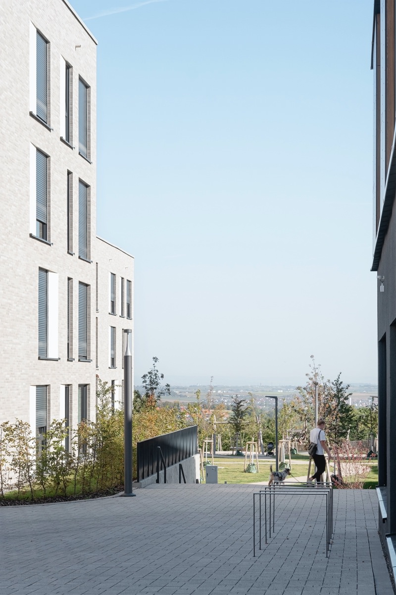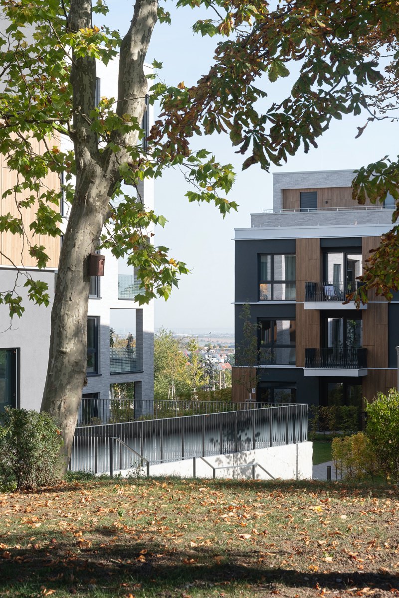 Das Wohngebiet auf dem ehemaligen TSG Areal besticht durch seine prägnante Hanglage und den damit verbundenen Weitblick, sowie den reizvollen Übergang in die freie Landschaft. Durch die U-förmige Anordnung der vier Wohnquartiere entsteht eine grüne Mitte aus großzügigen Wiesenflächen, die mit Obst- und Ahornbäumen gesäumt ist und die freie Landschaft bis ins Quartier erlebbar macht. Den Auftakt des Pandion LEON Areals bildet der Gemeinschaftsplatz mit tollem Ausblick auf diese Szenerie. Von diesem führt eine markante Treppenanlage zum zentralen Grünzug.